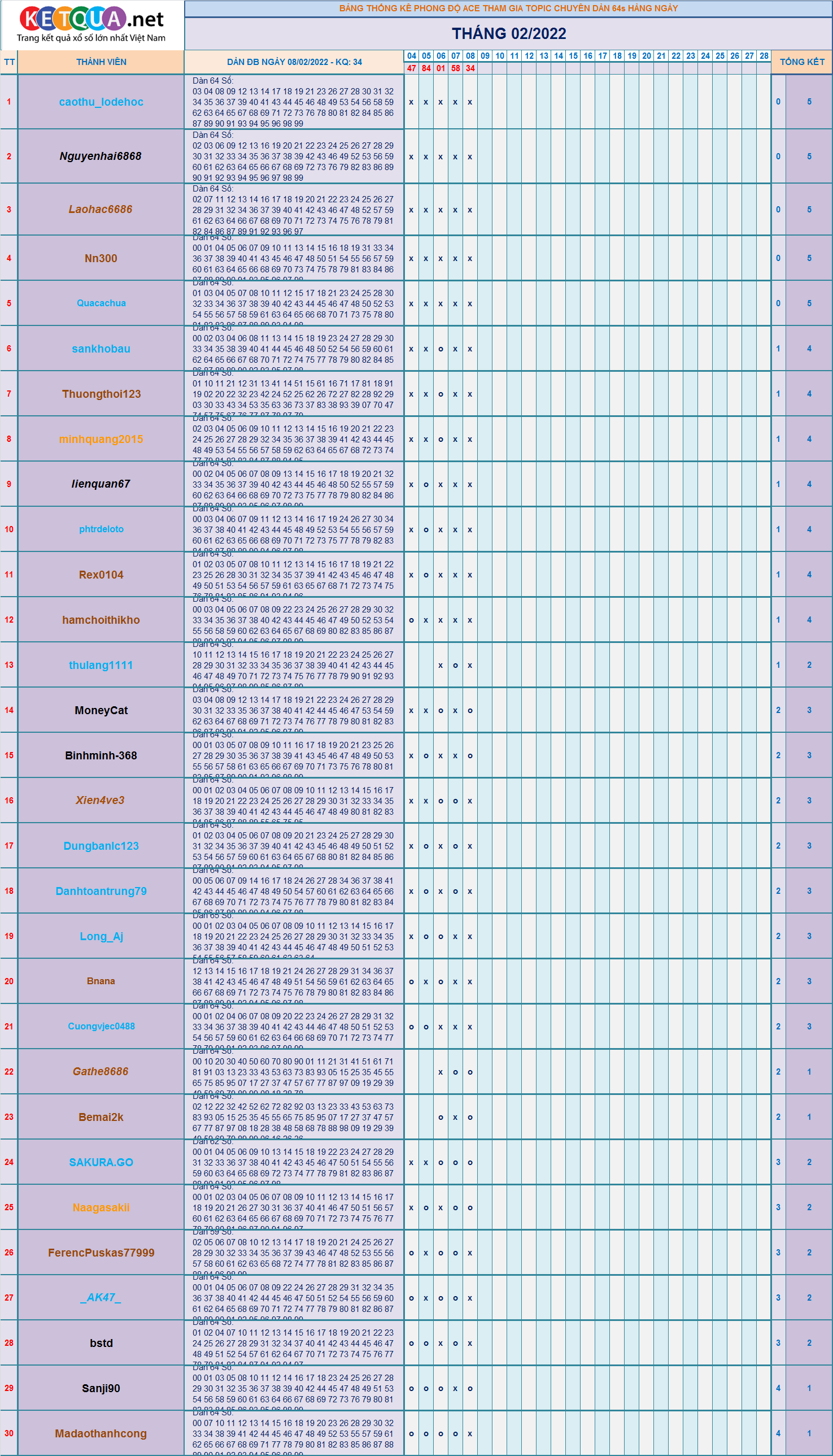 DÀN ĐẶC BIỆT XSMB 64S THÁNG 2/2022