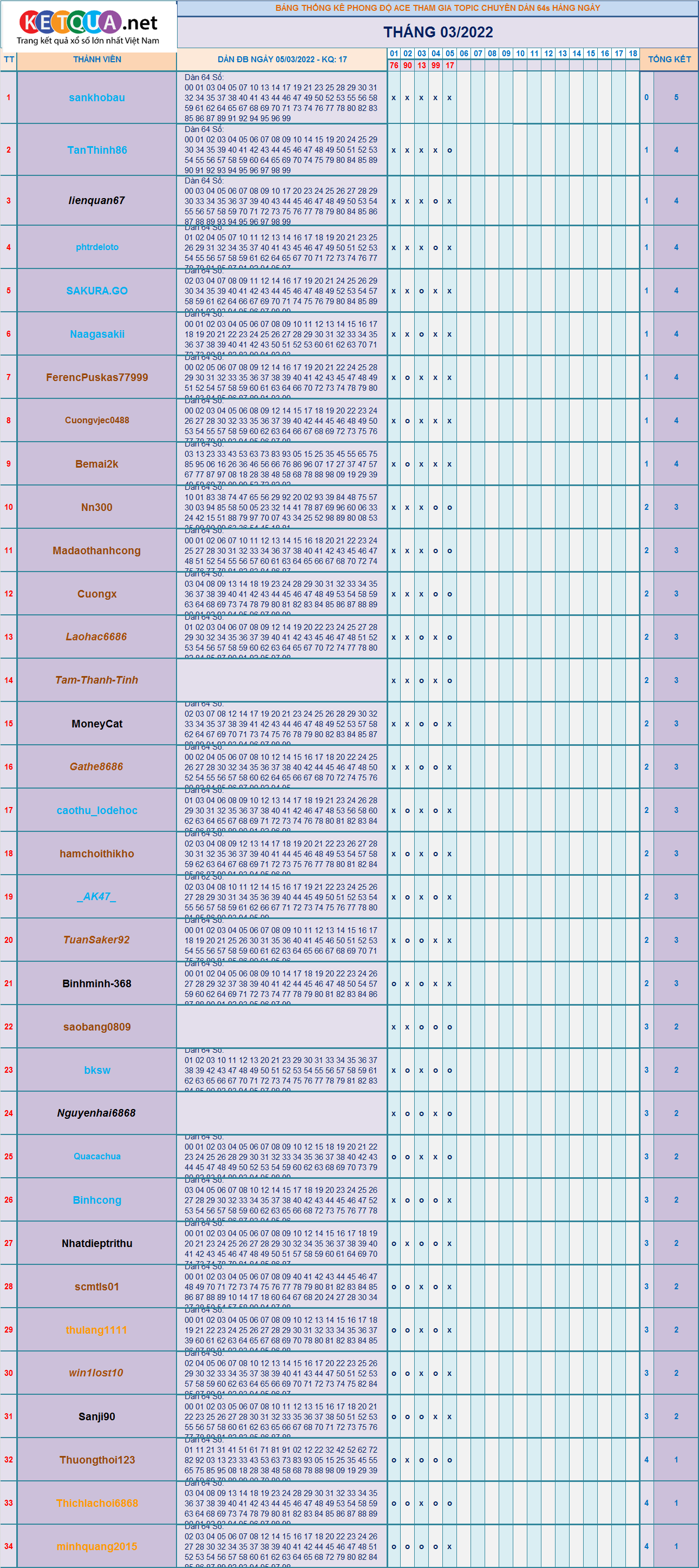 DÀN ĐẶC BIỆT XSMB 64S THÁNG 3/2022