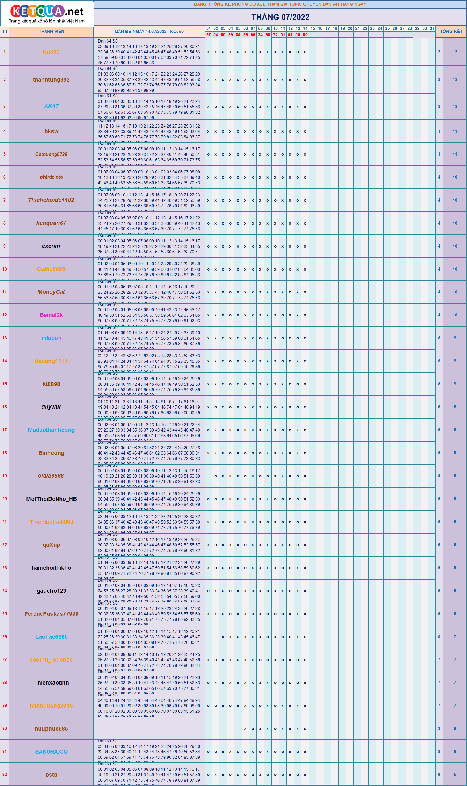 DÀN ĐẶC BIỆT XSMB 64S THÁNG 7/2022