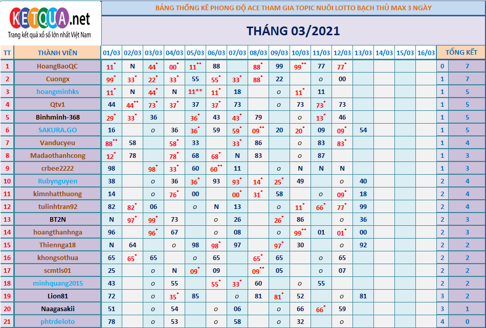 TOPIC CHĂN NUÔI XSMB BTL K3N THÁNG 03/2021
