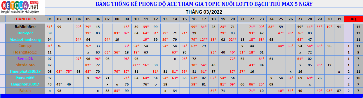 TOPIC CHĂN NUÔI XSMB BTL K5N THÁNG 03/2022