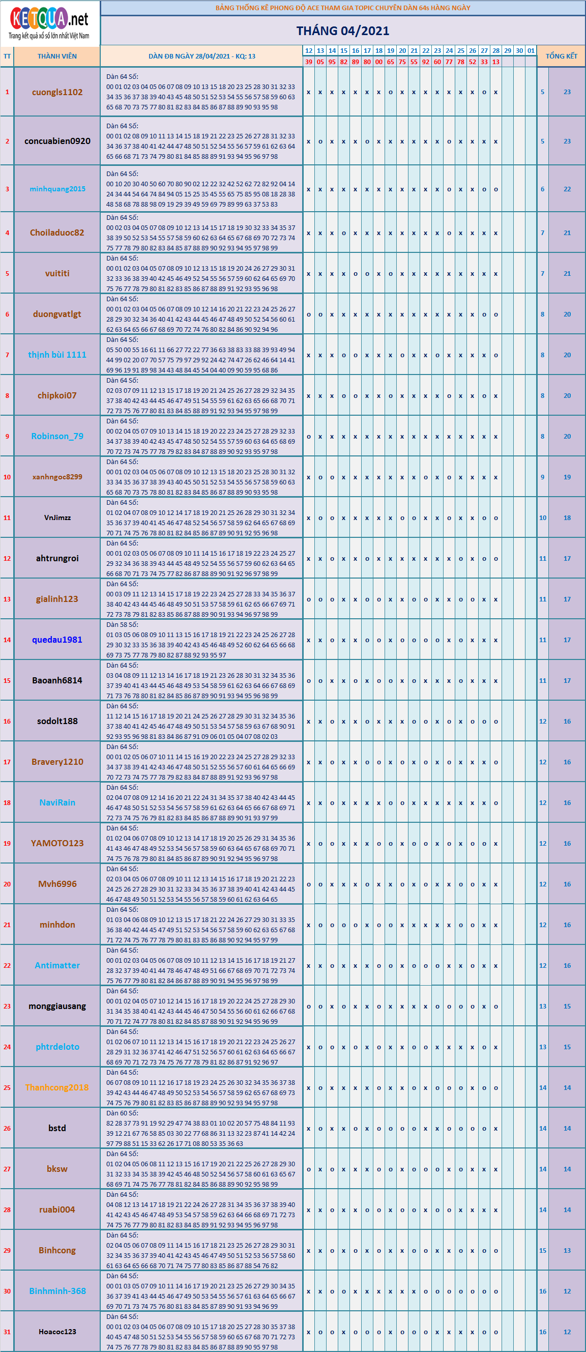 DÀN ĐẶC BIỆT XSMB 64S THÁNG 4/2021
