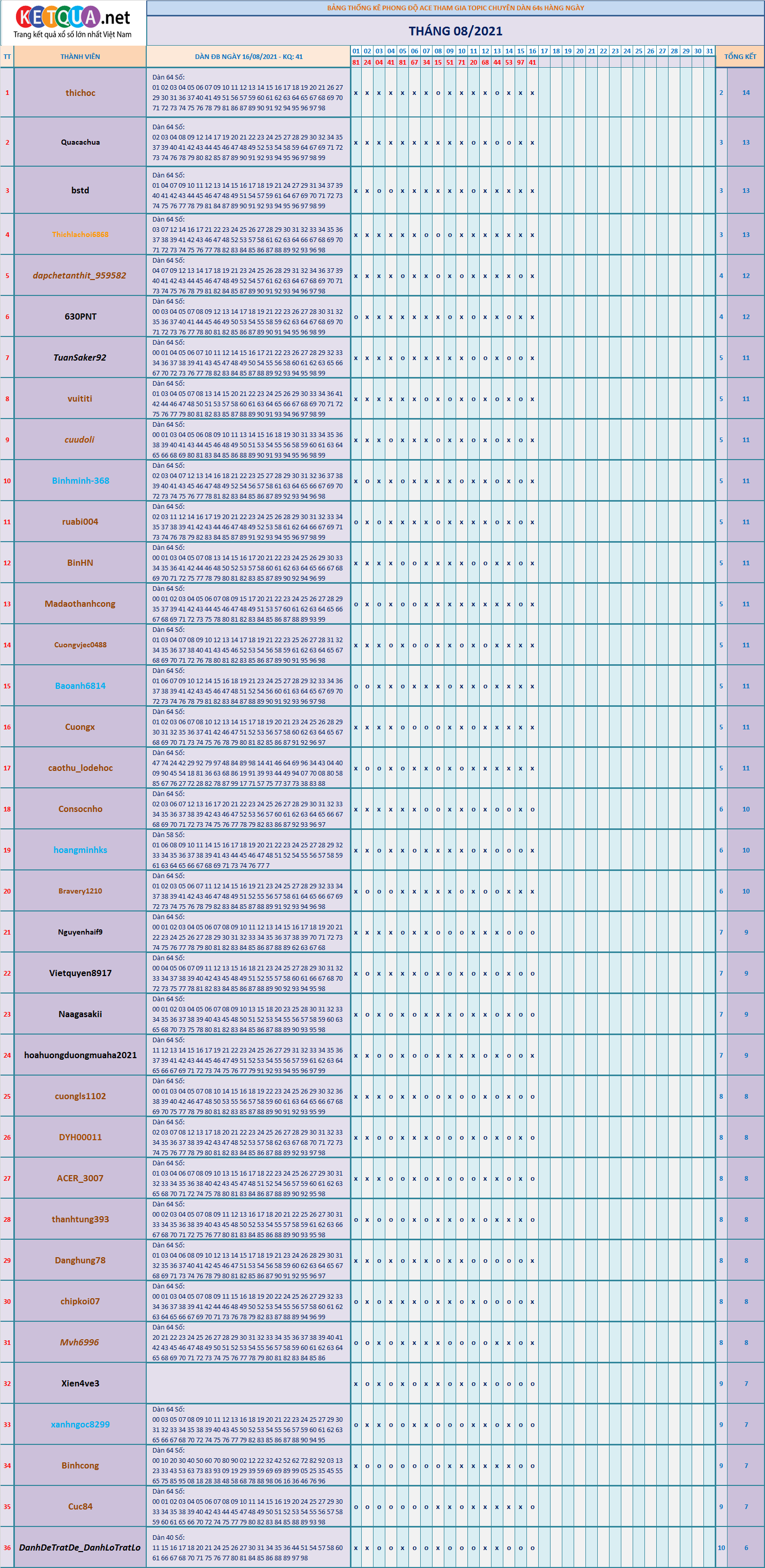 DÀN ĐẶC BIỆT XSMB 64S THÁNG 8/2021